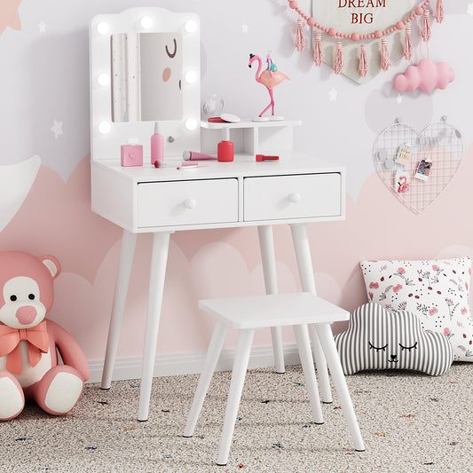 Pirecart Kids Vanity Table and Chair Set, Kids Wood Makeup Dressing Table with 7 Lights, Mirror, 2 Drawers