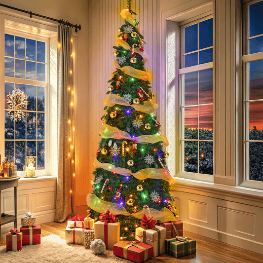 Pirecart 4/6/7 FT Artificial Christmas Tree Pre Lit Decorated with Remote Control Warm White Colored Lights, Collapsible Christmas Tree with 11 Light Models Colored Light Balls Ribbon Snowflake Holiday