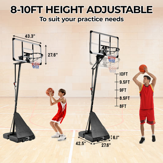 pirecart 44 in Portable Basketball Hoop System 8-10 FT Height Adjustable Basketball Hoop