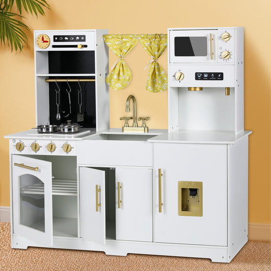 pirecart Kids Play Kitchen, Wooden Pretend Toy Kitchen, Toodler Cooking Playset w/Stove, Sink, Microwave, Water Dispenser, Curtain