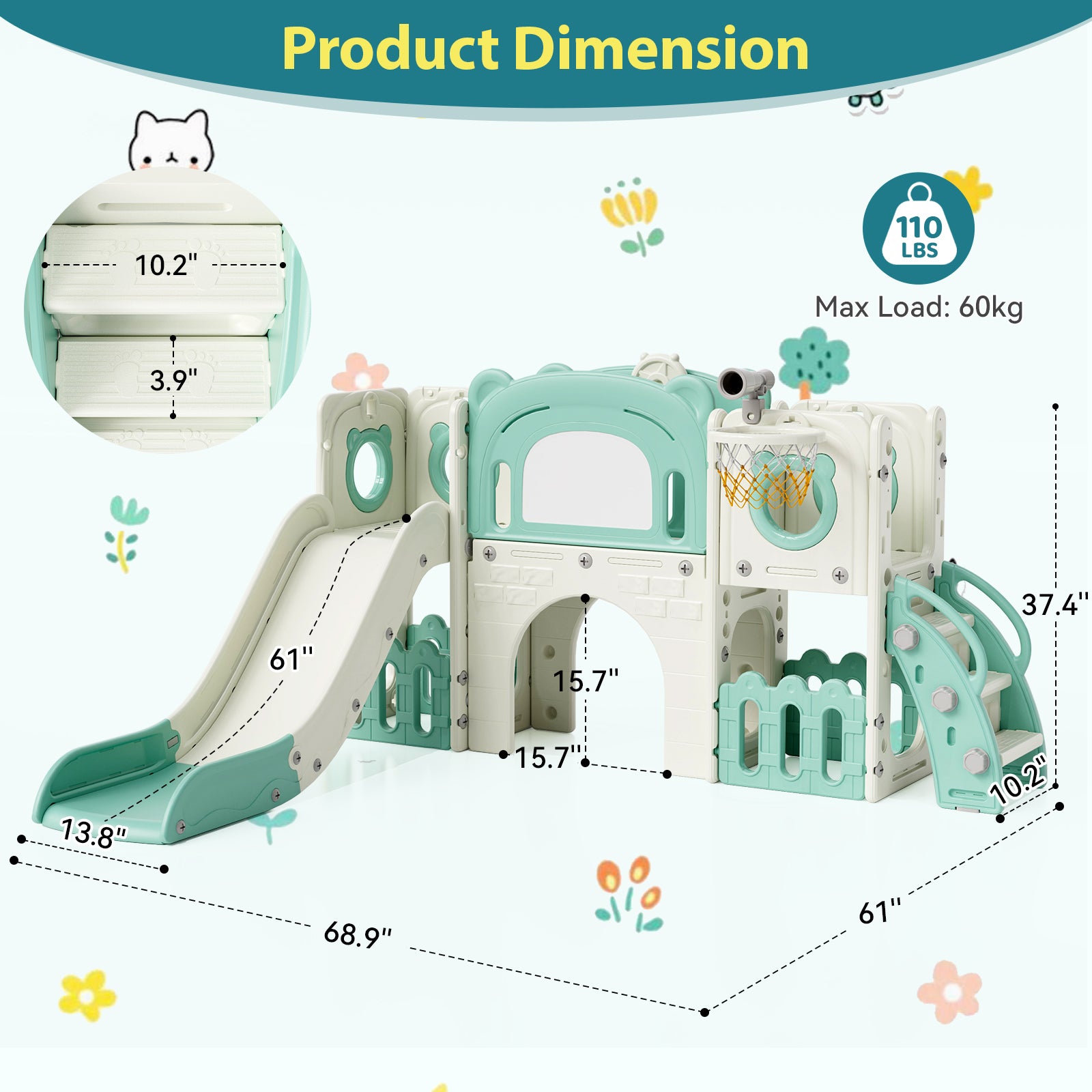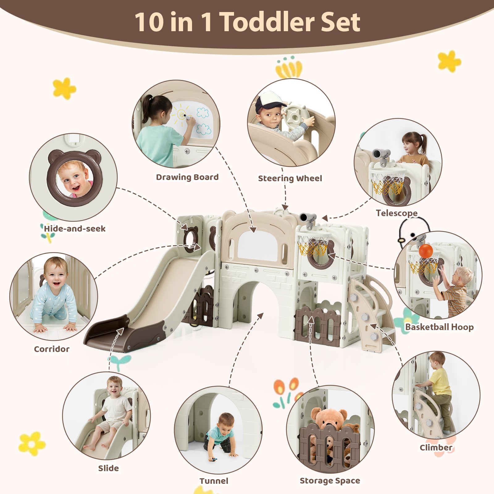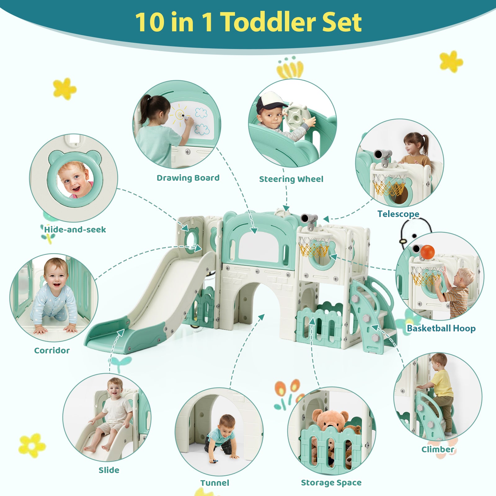 - 10-in-1 Toddler Playground】Toddler slide combines 10 fun activity stations into one, including slide, climber, telescope, hide-and-seek, corridor, drawing board, storage space, tunnel, basketball hoop, and steering wheel. It's a creative space sparks imagination development.