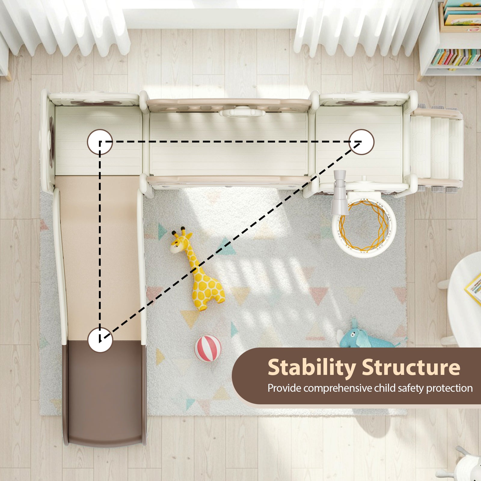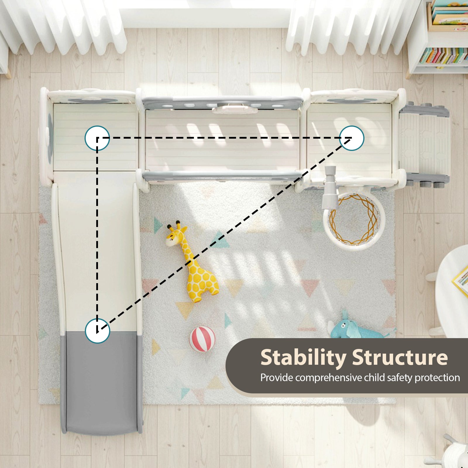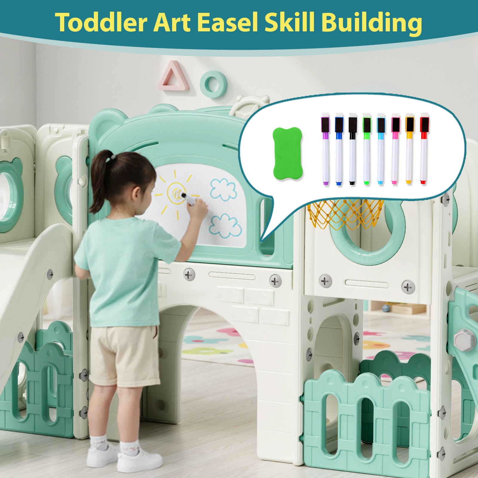 - 10-in-1 Toddler Playground】Toddler slide combines 10 fun activity stations into one, including slide, climber, telescope, hide-and-seek, corridor, drawing board, storage space, tunnel, basketball hoop, and steering wheel. It's a creative space sparks imagination development.