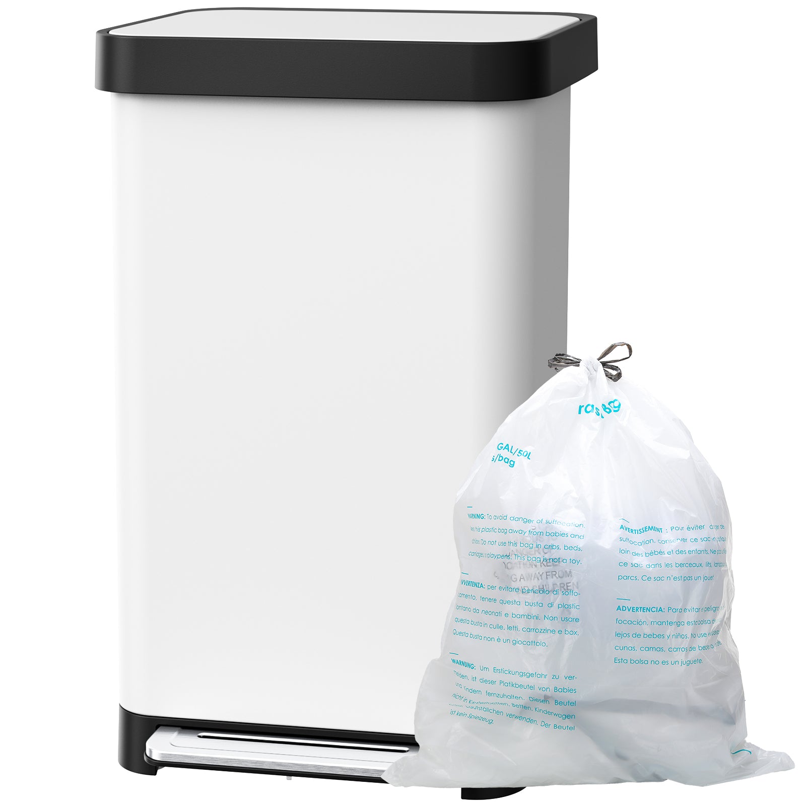 Pirecart 13.2 Gal Stainless Steel Trash Can, Soft-Close Lid Grabage Can with 15 Inner Bags, Rear Trash Bag Storage Compartment, Large Capacity Step Trash Can With Built-In Deodorizer Box