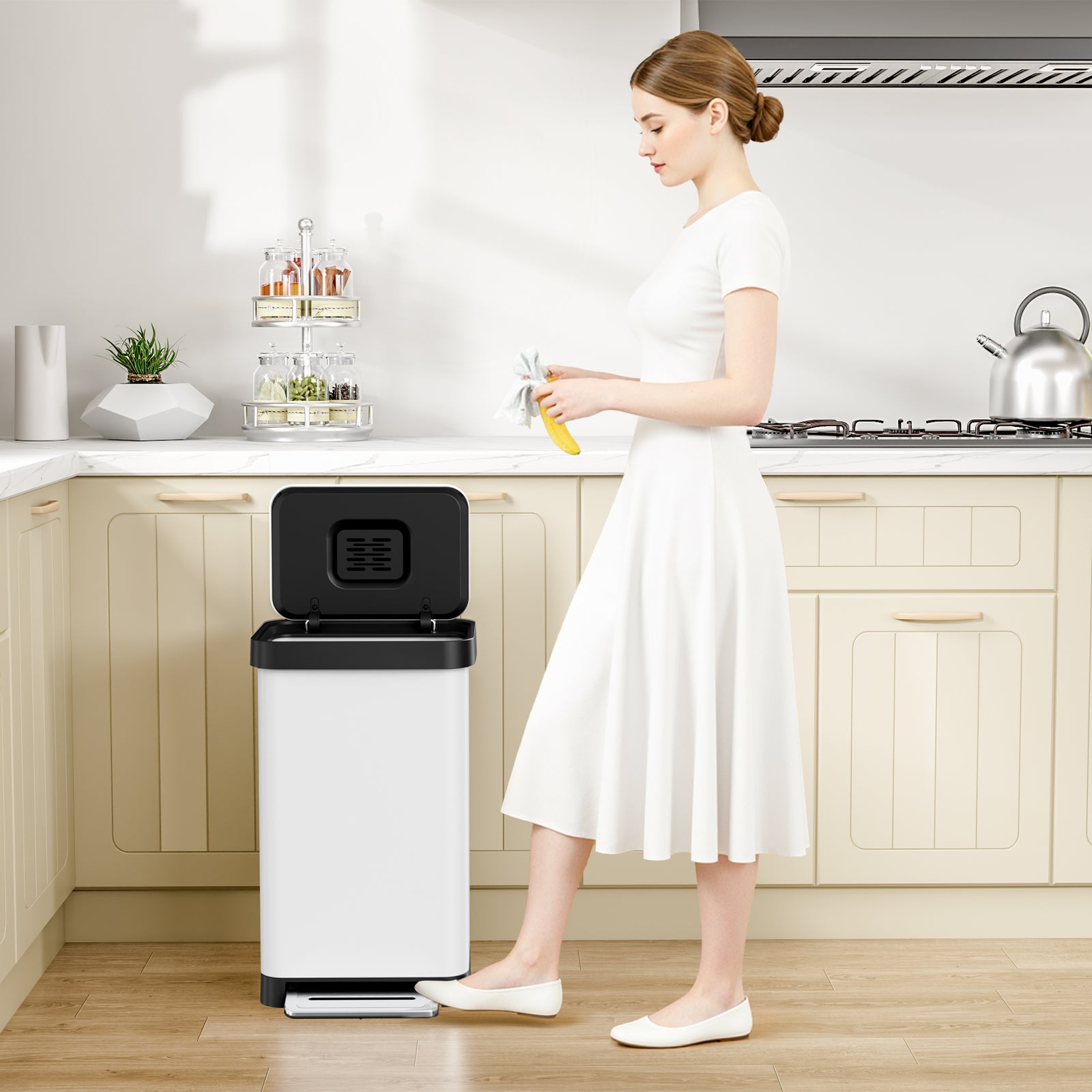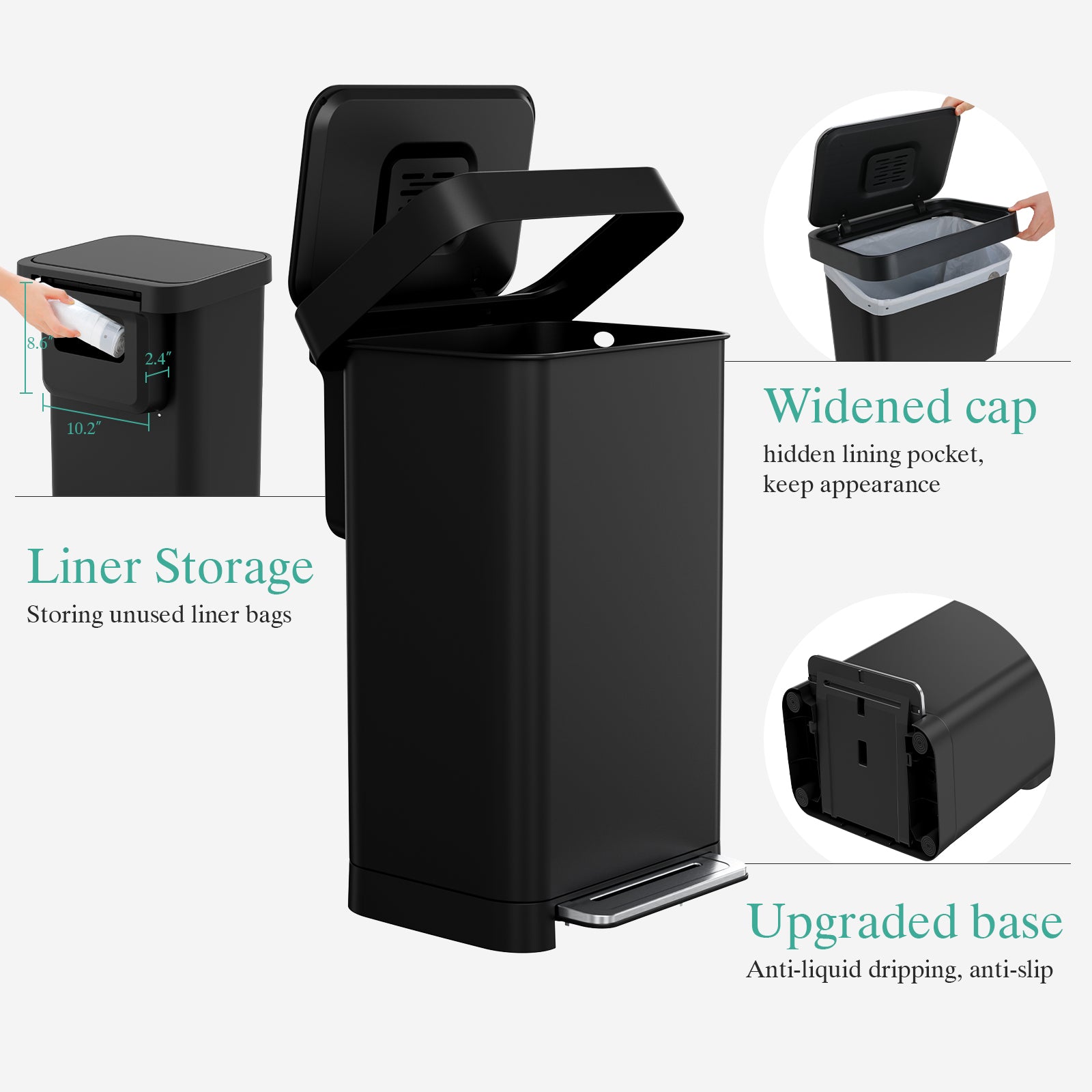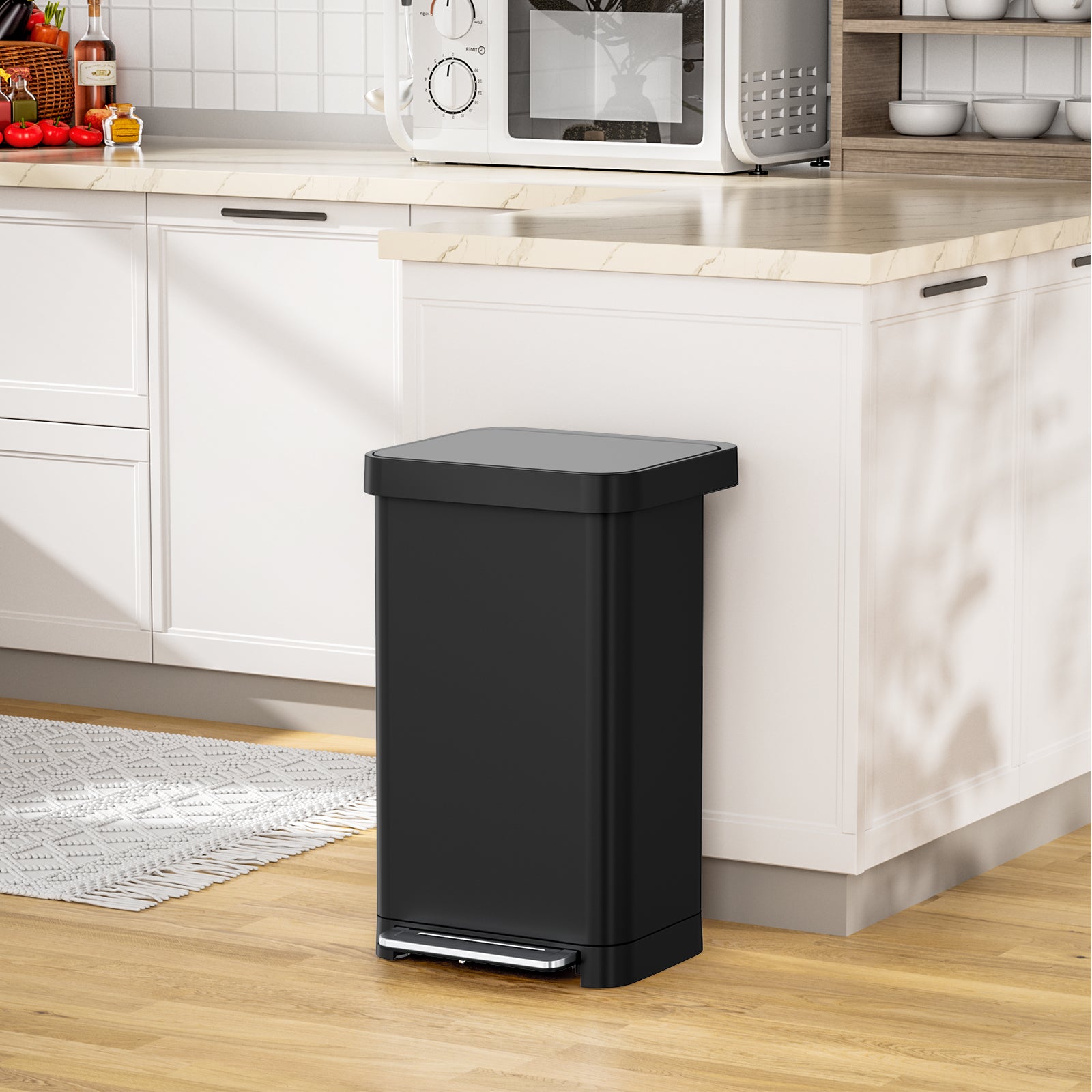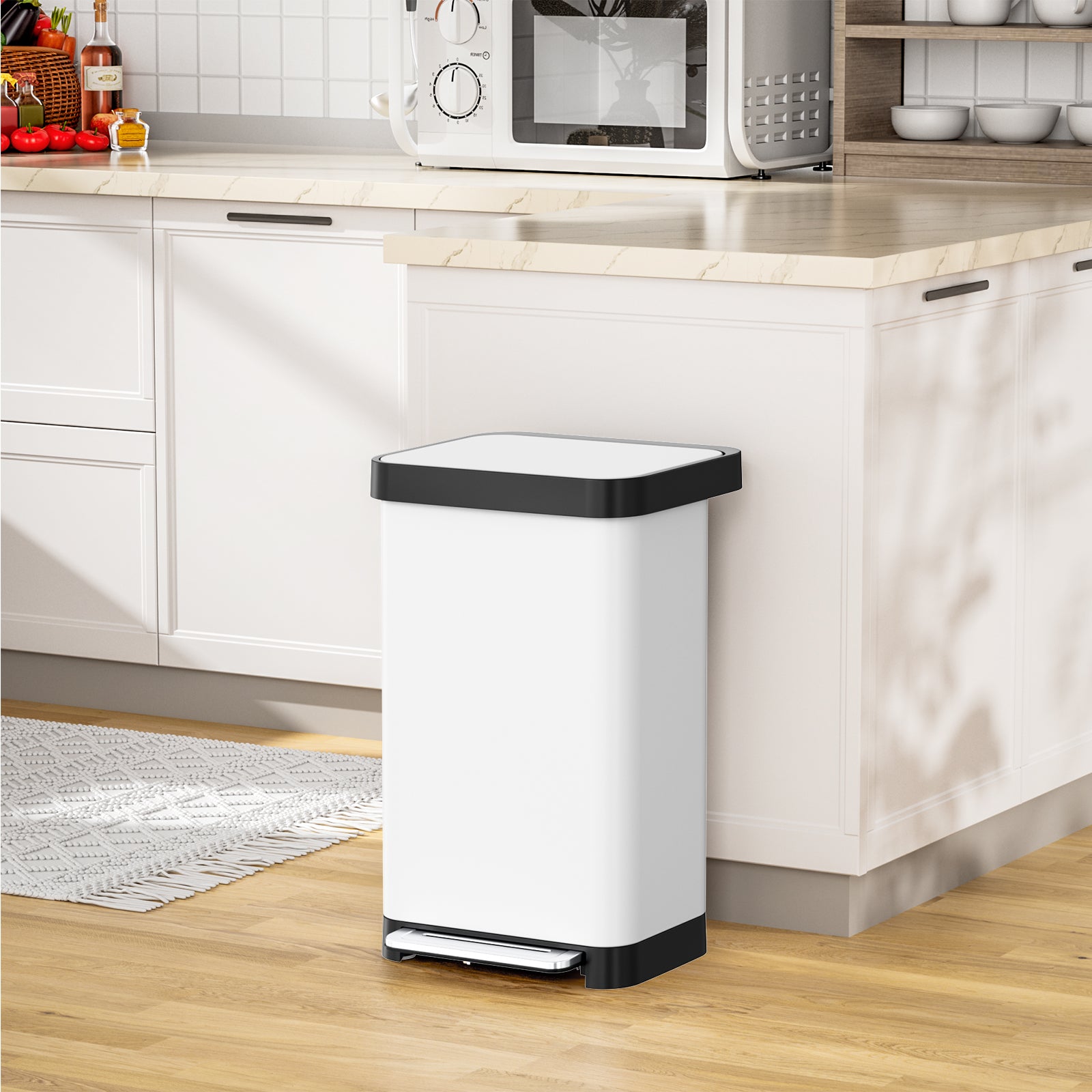 - 【Sealed Non-Slip Base】Large kitchen trash can has a thickened rubber anti-slip base, which can keep hands-free step trash can stable, will not damage the floor, and will not let liquid leak out, ideal for home and commercial use