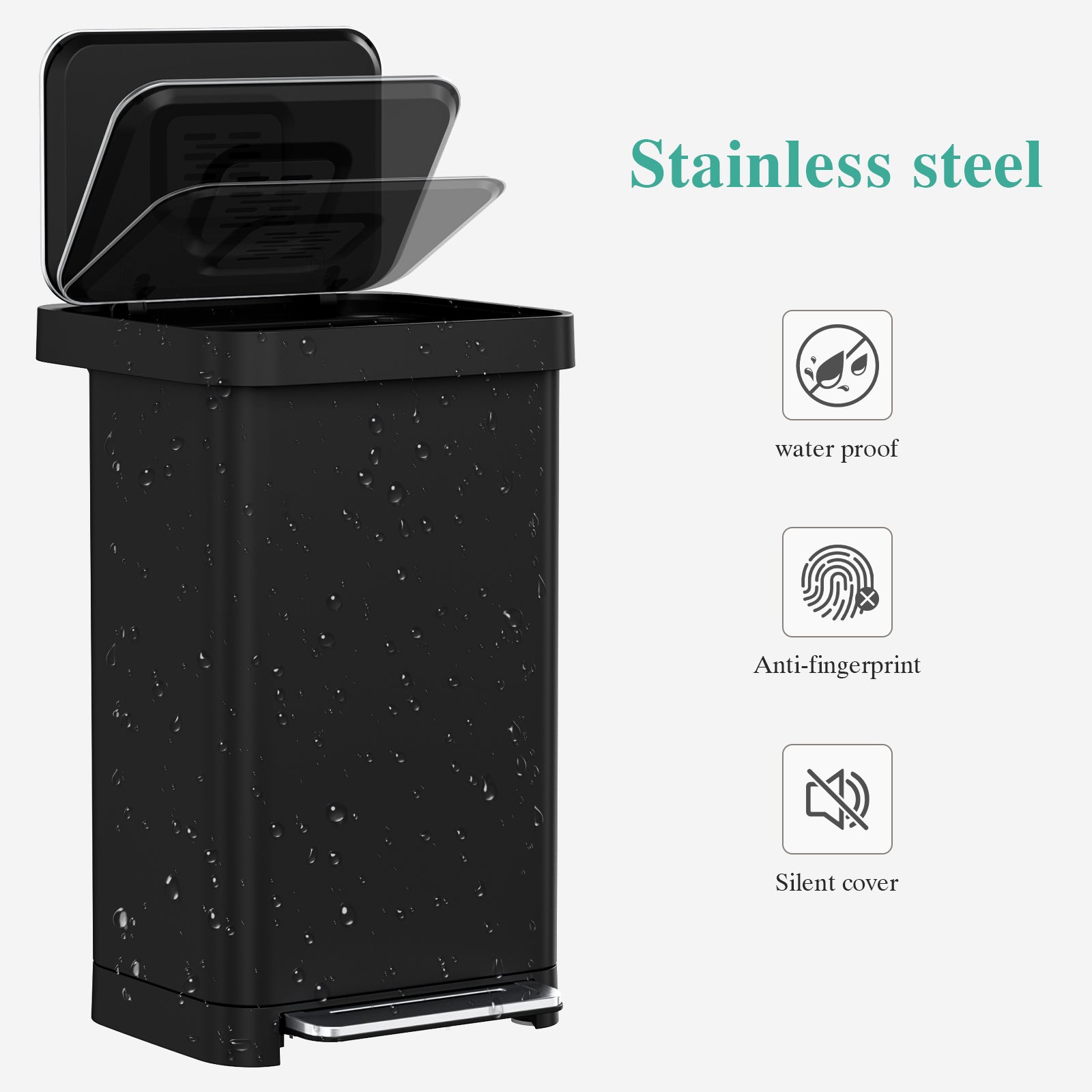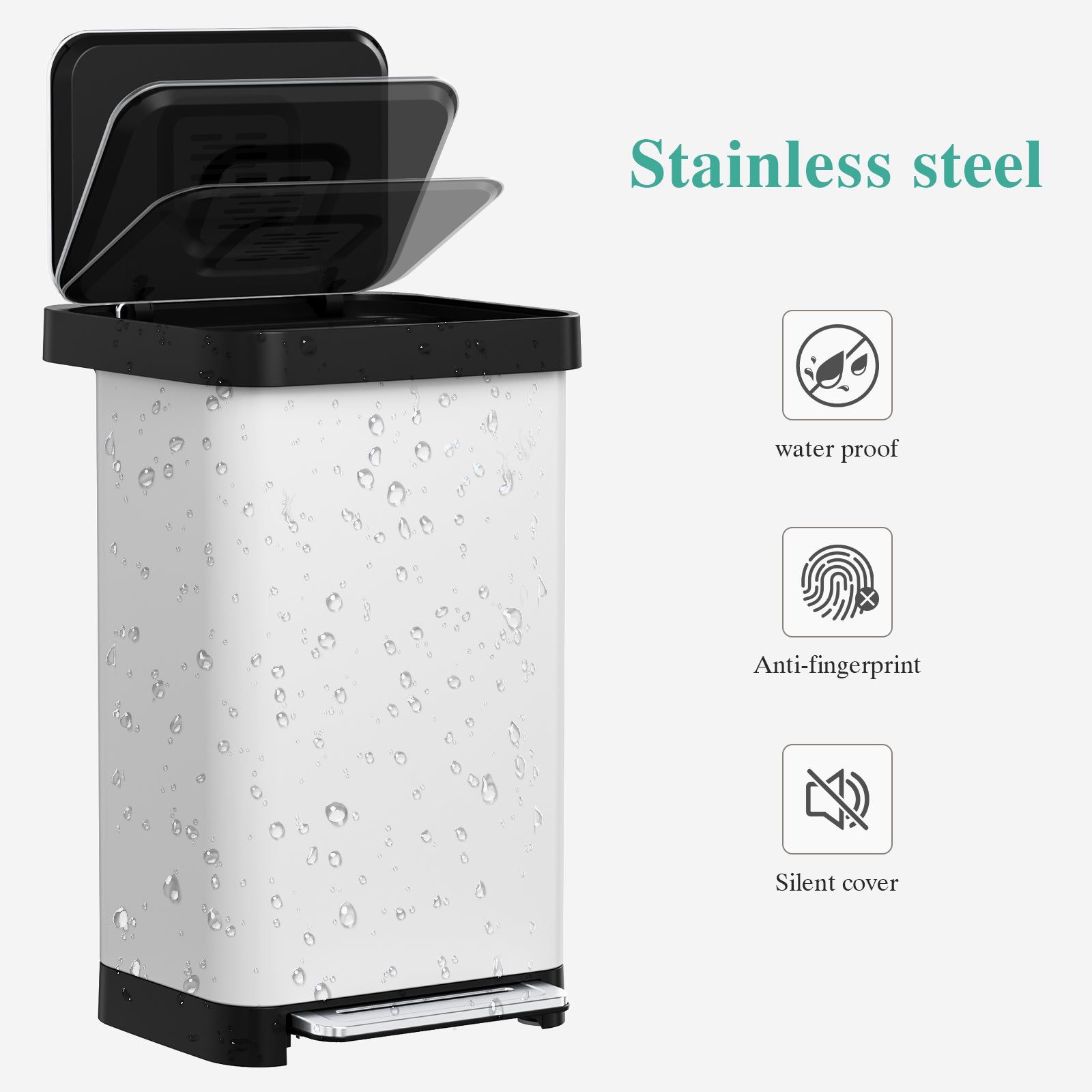 - 【Foot Pedal & Silent Lid】Stainless steel trash can has a 10.6" wide foot pedal, which allows you to easily open the hands-free kitchen garbage bin lid with just a light step without having to bend over. Quiet lid closing design makes no unnecessary noise and closes softly
