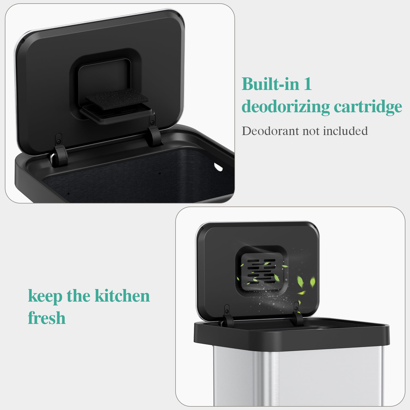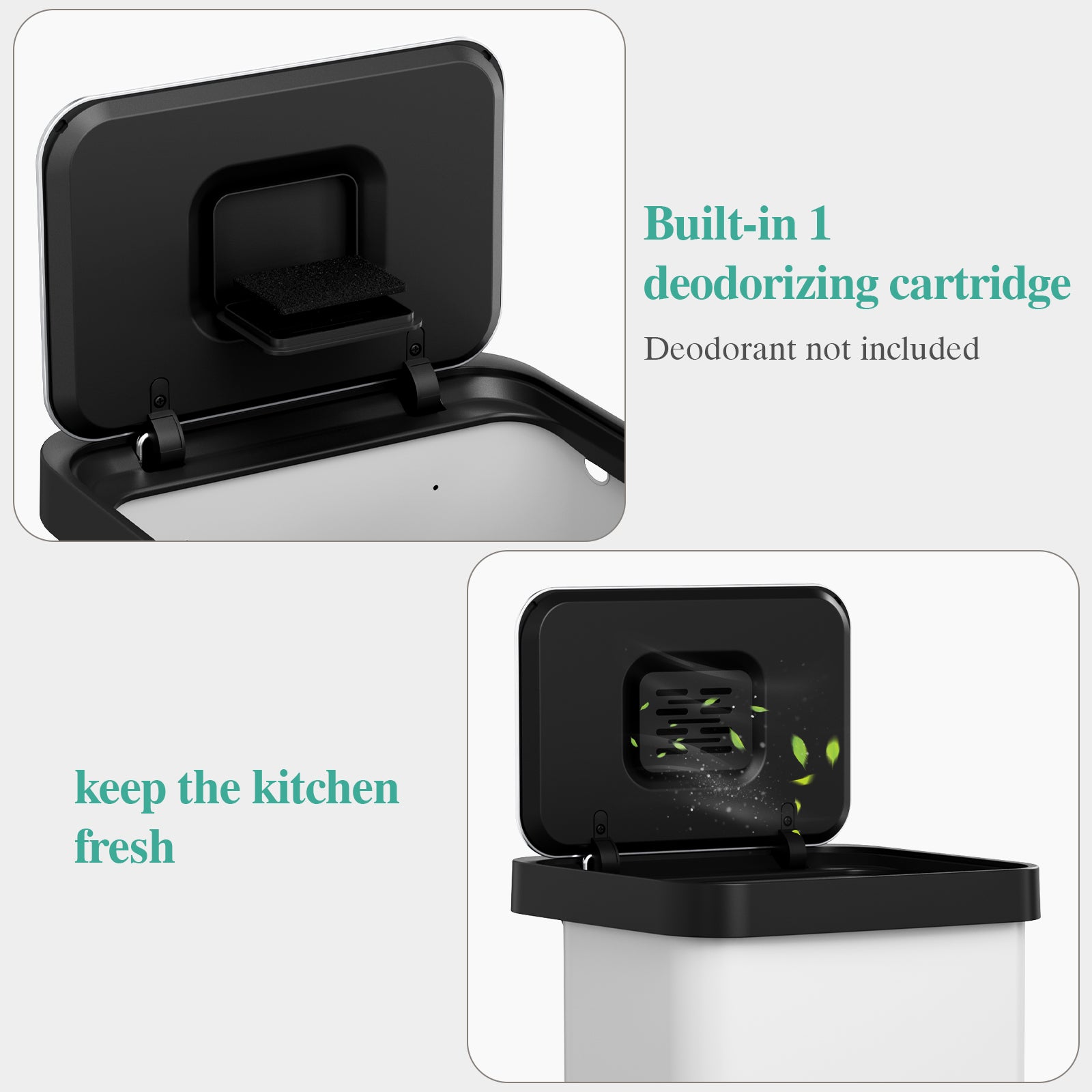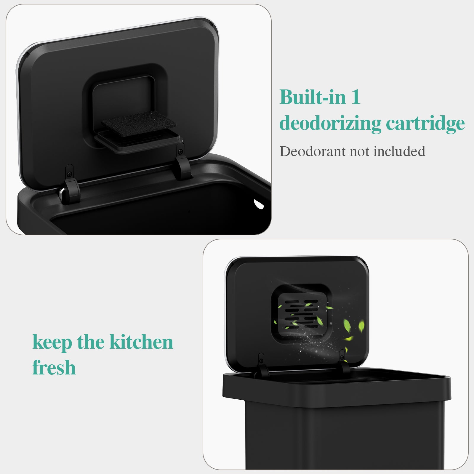 - 【Built in Odor Filter & Sealing Lid】Kitchen garbage can has a built-in 4.7" x 3.54" deodorant box. You only need to snap open the lid, put in the deodorant you want (deodorant is not included in the product). Garbage cans for kitchen sealing lid design can lock in odors, keeping the kitchen fresh and tidy