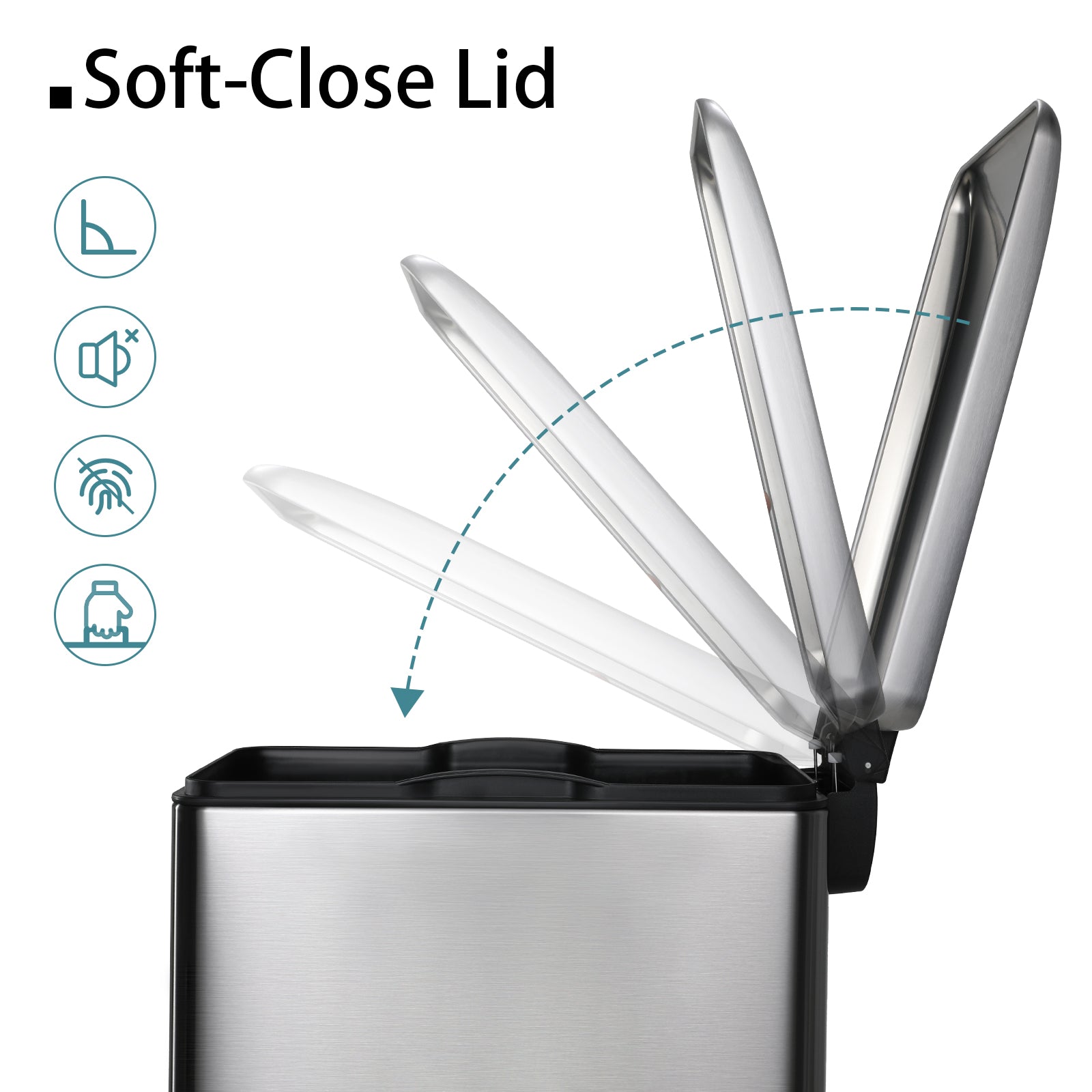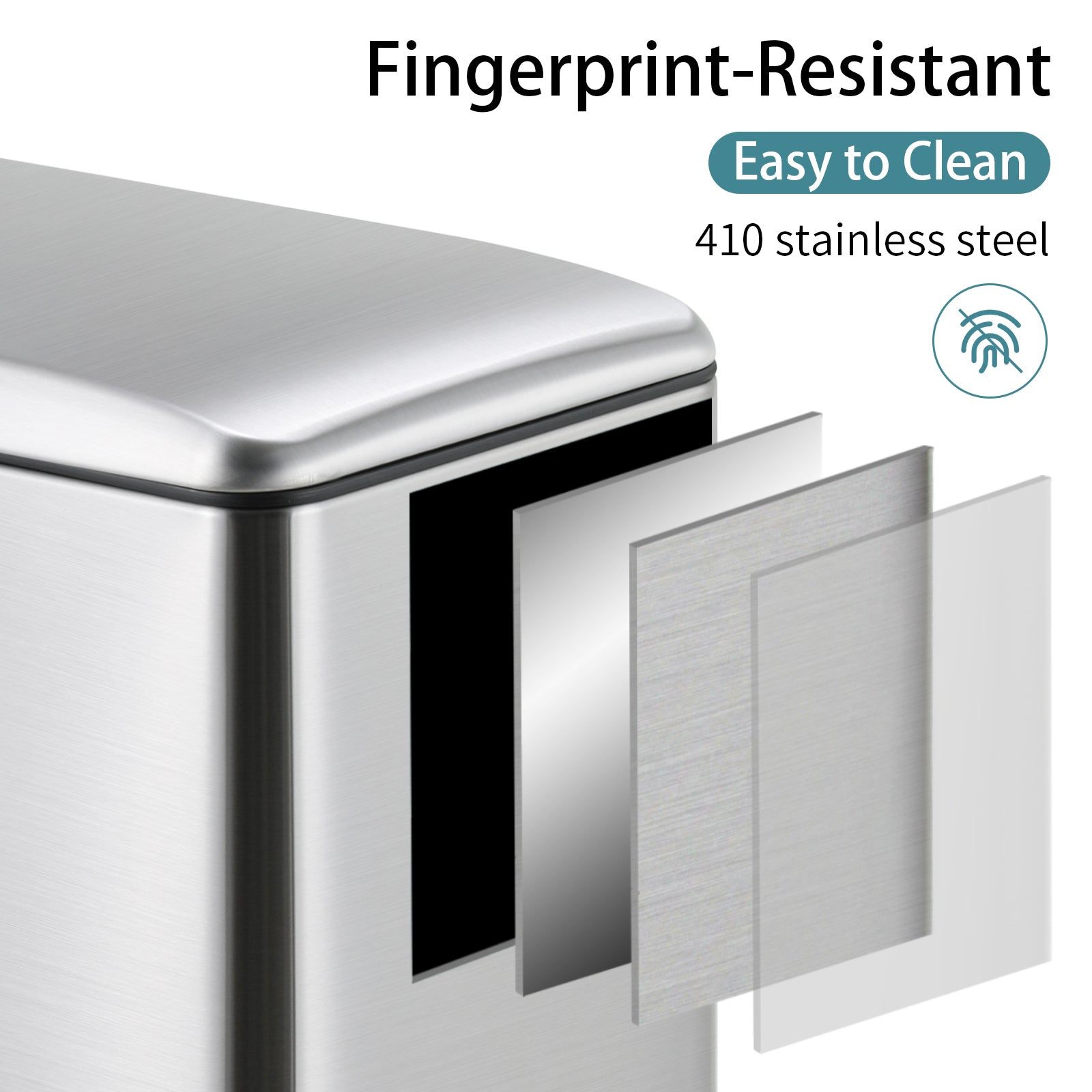 【Easy To Clean】 Kitchen garbage can is anti-fingerprint, anti-stain and easy to clean, you just need to wipe the surface of the trash cans with a damp cloth. Inner plastic bucket can be easily removed , it's convenient to empty trash and clean—just lift out, dispose, and wipe down for a fresh new trash can.