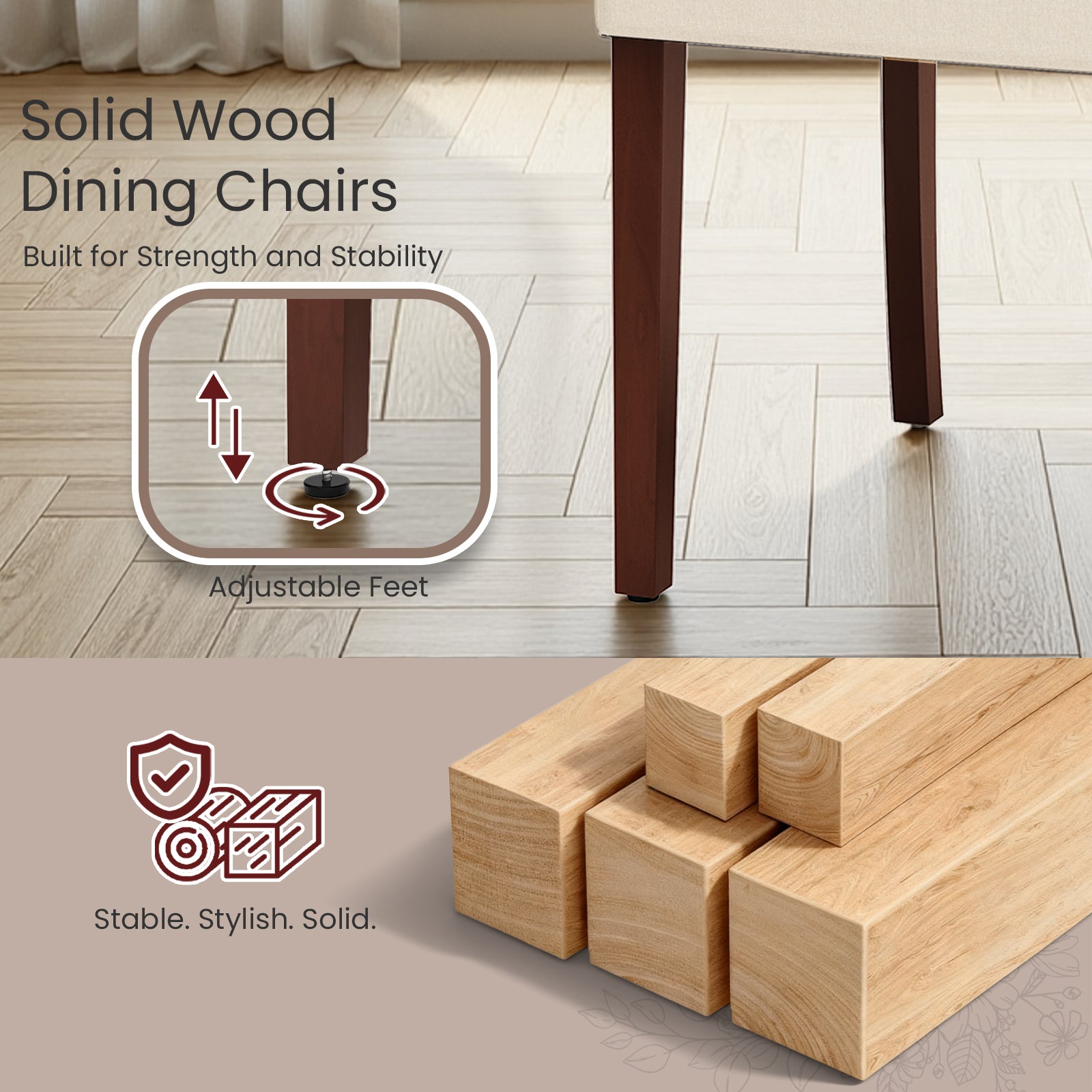 - 【Robust Construction & Certified Durability】Built with solid rubber wood legs and reinforced frames, each chair supports 350+ lbs. The rubber adjustable feet on the chair legs prevent any scratches or damage to your floors, ensuring long-lasting durability and stability.