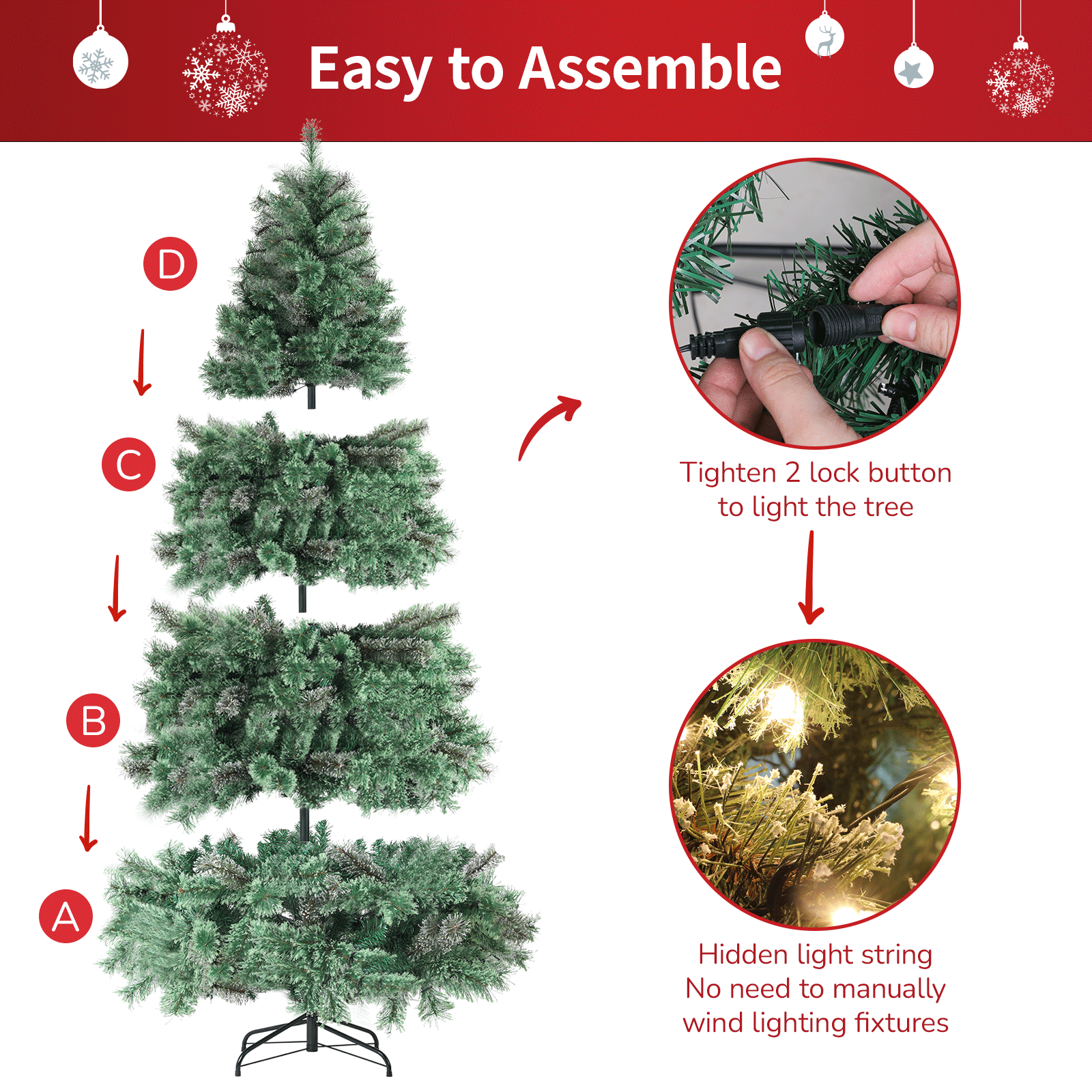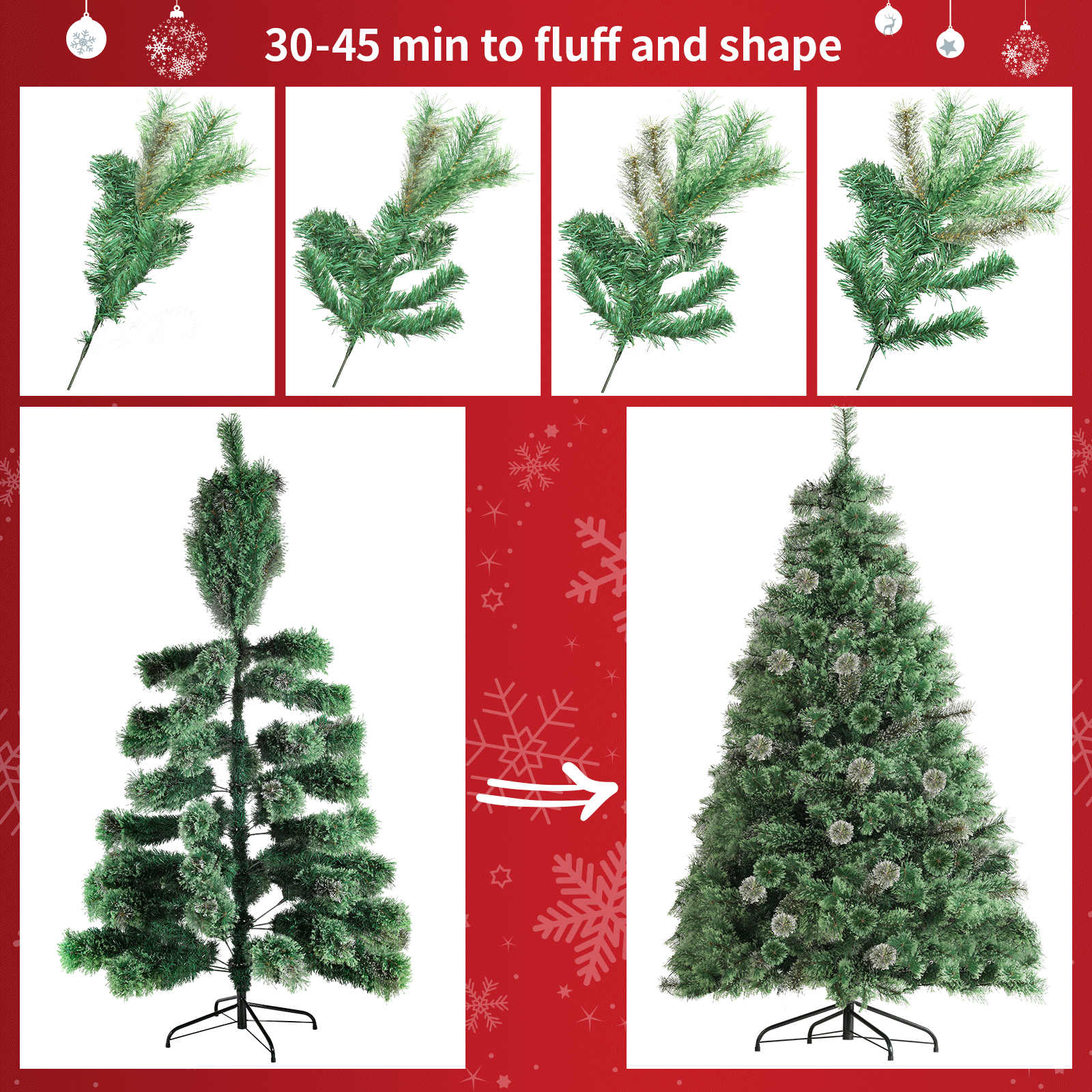 EASY TO ASSEMBLE: Artificial flocked Christmas tree consists of three parts. To install, simply unfold the foldable metal stand and attach it from bottom to top. The tree is attached by metal hinges and can be easily disassembled into sections for storage. Xmas tree requires approximately 30-45 minutes of branch fluffing to achieve a lush, realistic appearance.