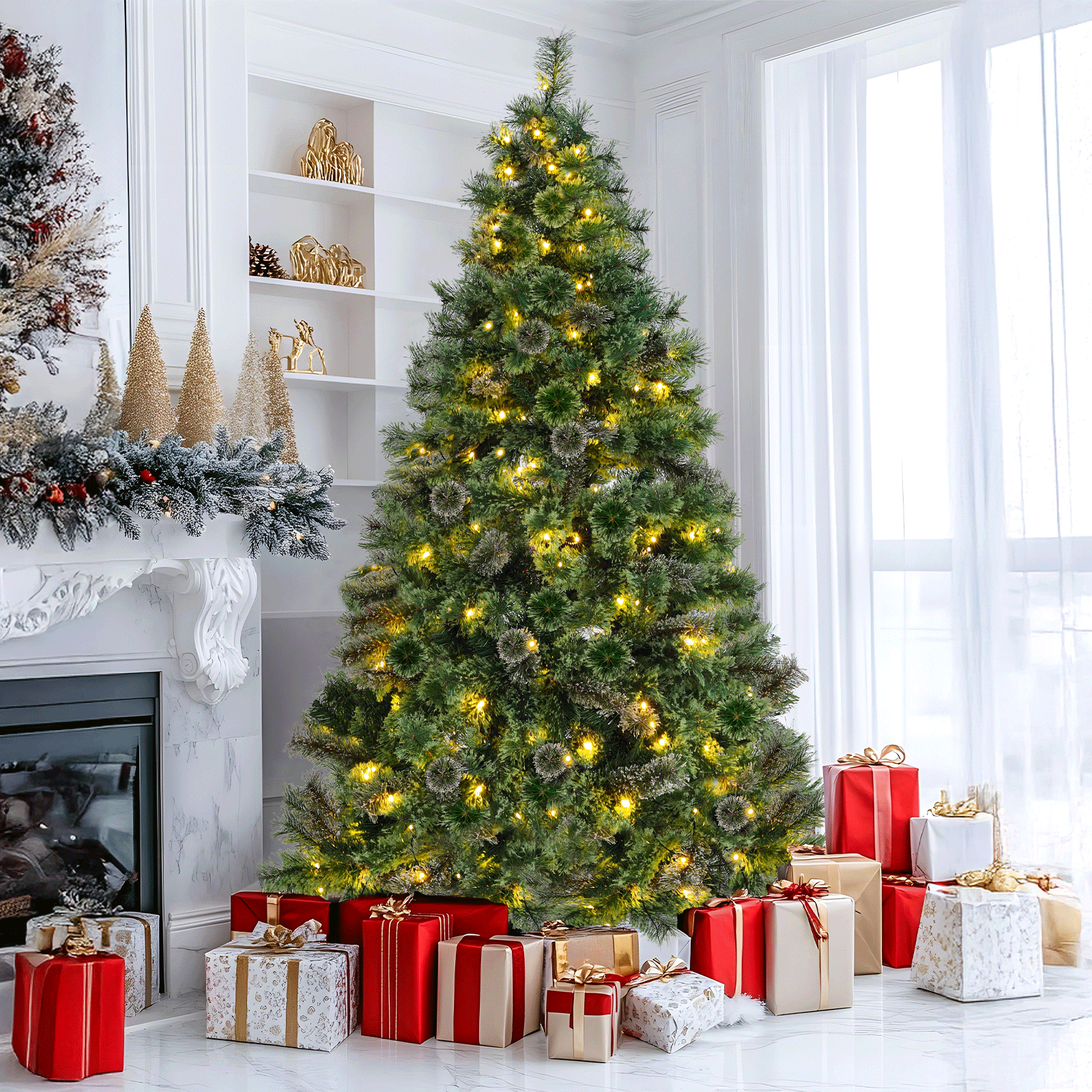 PRE-LIT CHRISTMAS TREE: Overall size: 107.9×57.1×57.1 in. 9 ft Christmas tree is individually pre-installed with 500 warming lights that emit a warm and natural glow, adding a charming holiday atmosphere to your home.