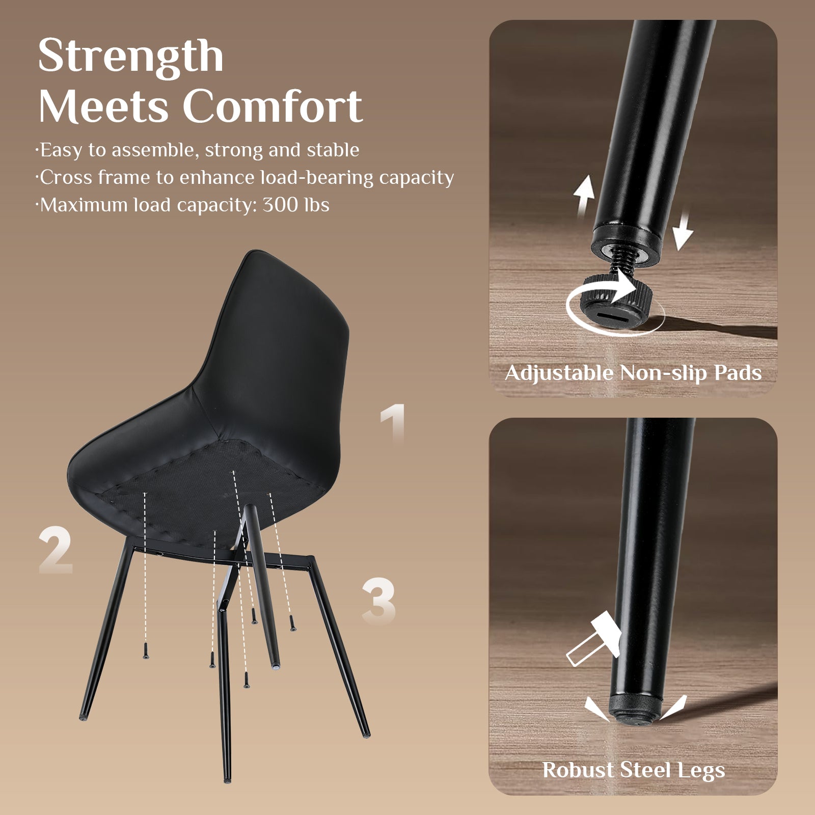 - 【Sturdy Metal Construction】Built with a thickened metal frame and reinforced X-base foundation, these chairs provide maximum stability and support up to 300 lbs. Adjustable anti-slip foot pads adapt to uneven floors (hardwood, tile, or carpet), preventing scratches and wobbling for a safe, quiet seating experience.