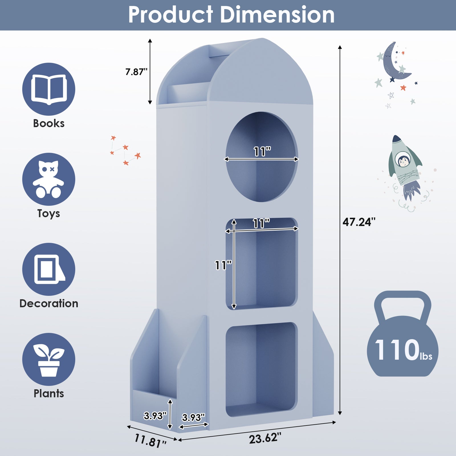 Toddler bookshelf measures 23.6" W x 11.8" D x 47.2" H, 3 tiers wooden bookshelves provide ample storage for books and toys, and the bottom side shelves are used to display books or home décor items
