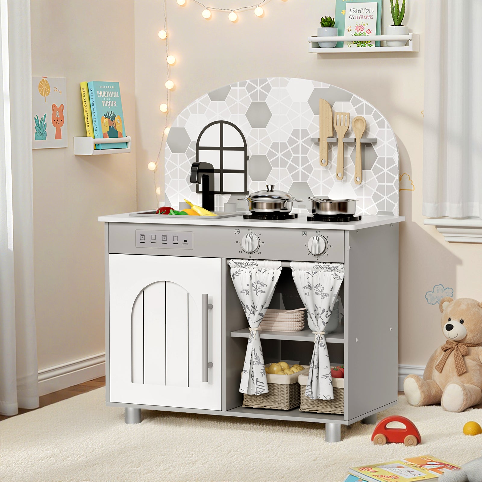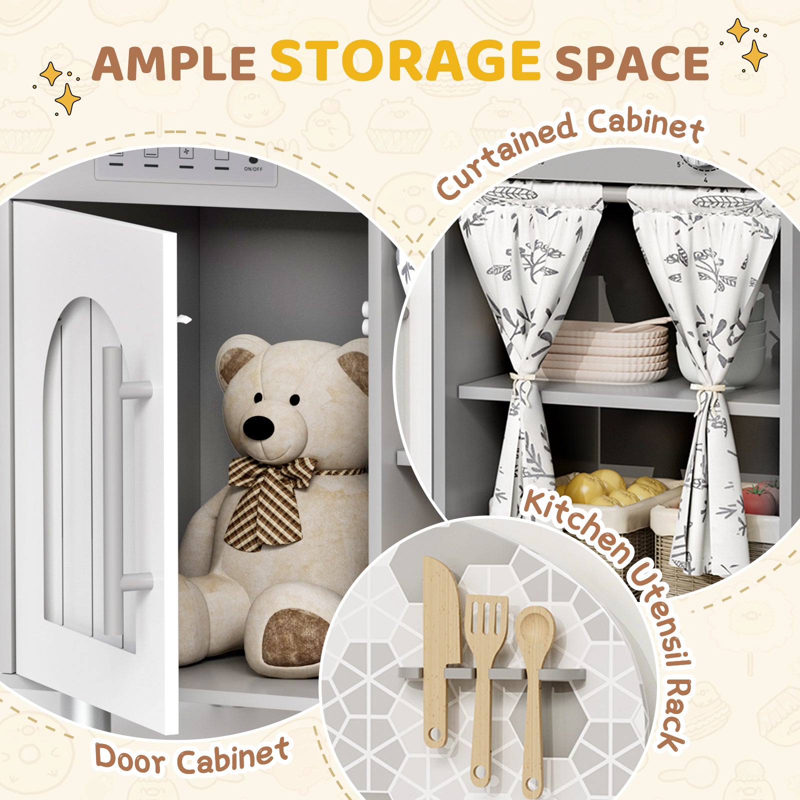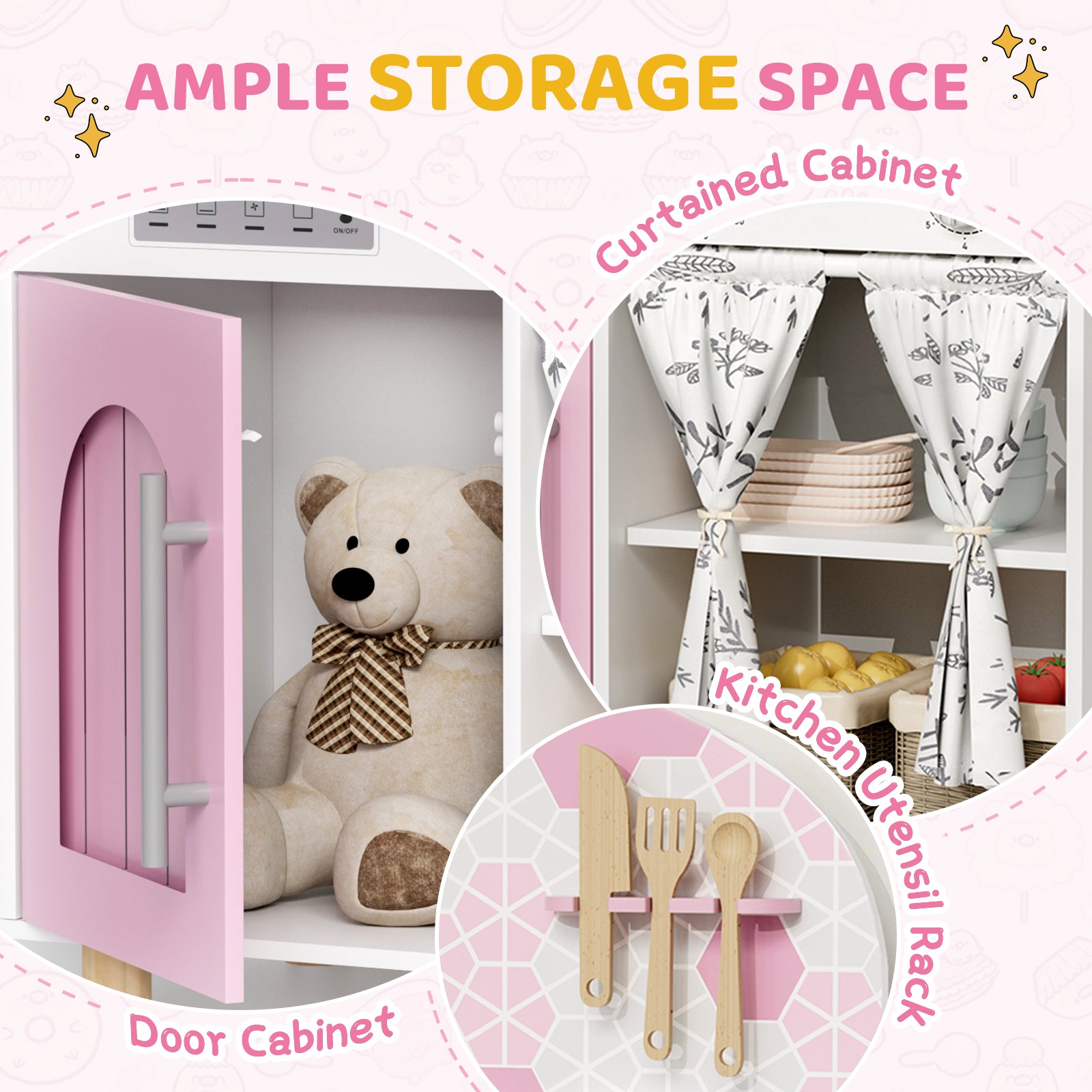 - 【Tidy Home for Toys】Play kitchen features a cabinet with a door and a double-layer unit with curtains, offering plenty of space to tuck away all their cooking gear, play food, and favorite companions. Everything stays neat and ready for the next culinary adventure