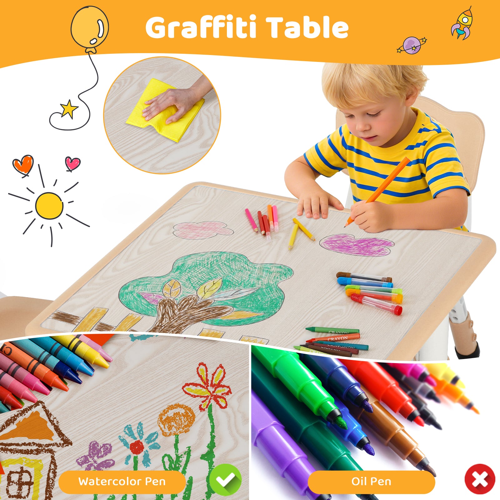 - 【DRY-ERASE DESKTOP】Easy clean desktop is easy to keep stain-free. The table top can be drawn and erased with water-based pens.