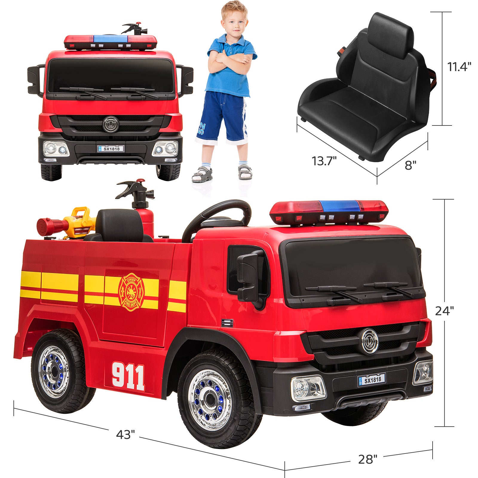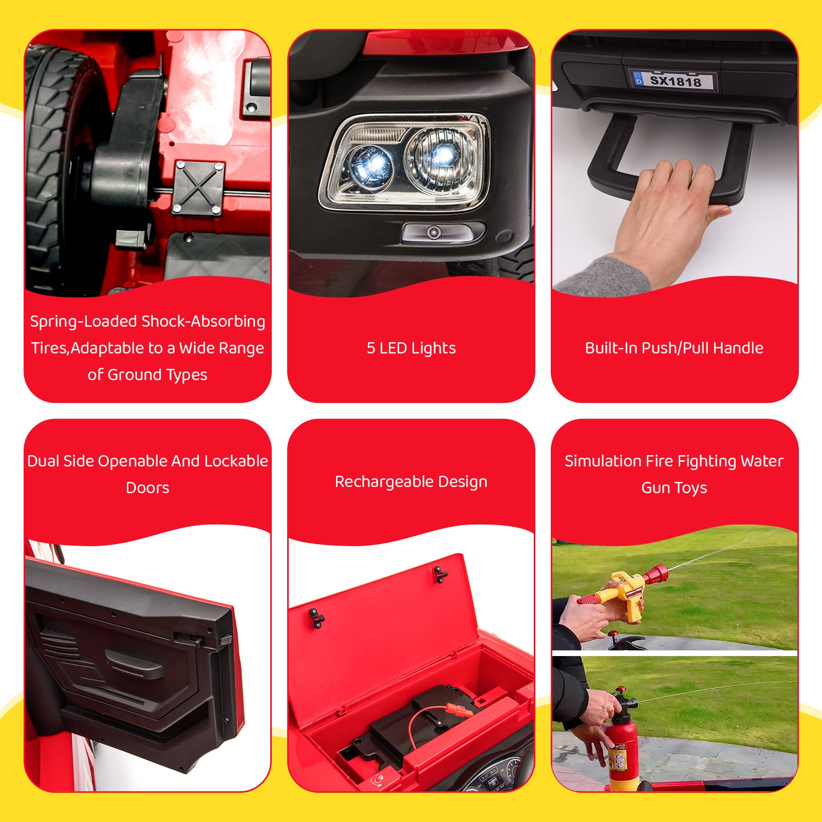 MULTI-FUNCTIONAL DESIGN - Rides on fire trucks, simulated fire extinguisher, water cannon and helmet, realistic siren, seat belt, openable doors, power pedals, 5 LED headlights, MP3 input and playback. A variety of functions can provide your child with a nearly real fire truck driving experience, satisfying your child's firefighter dress up experience.