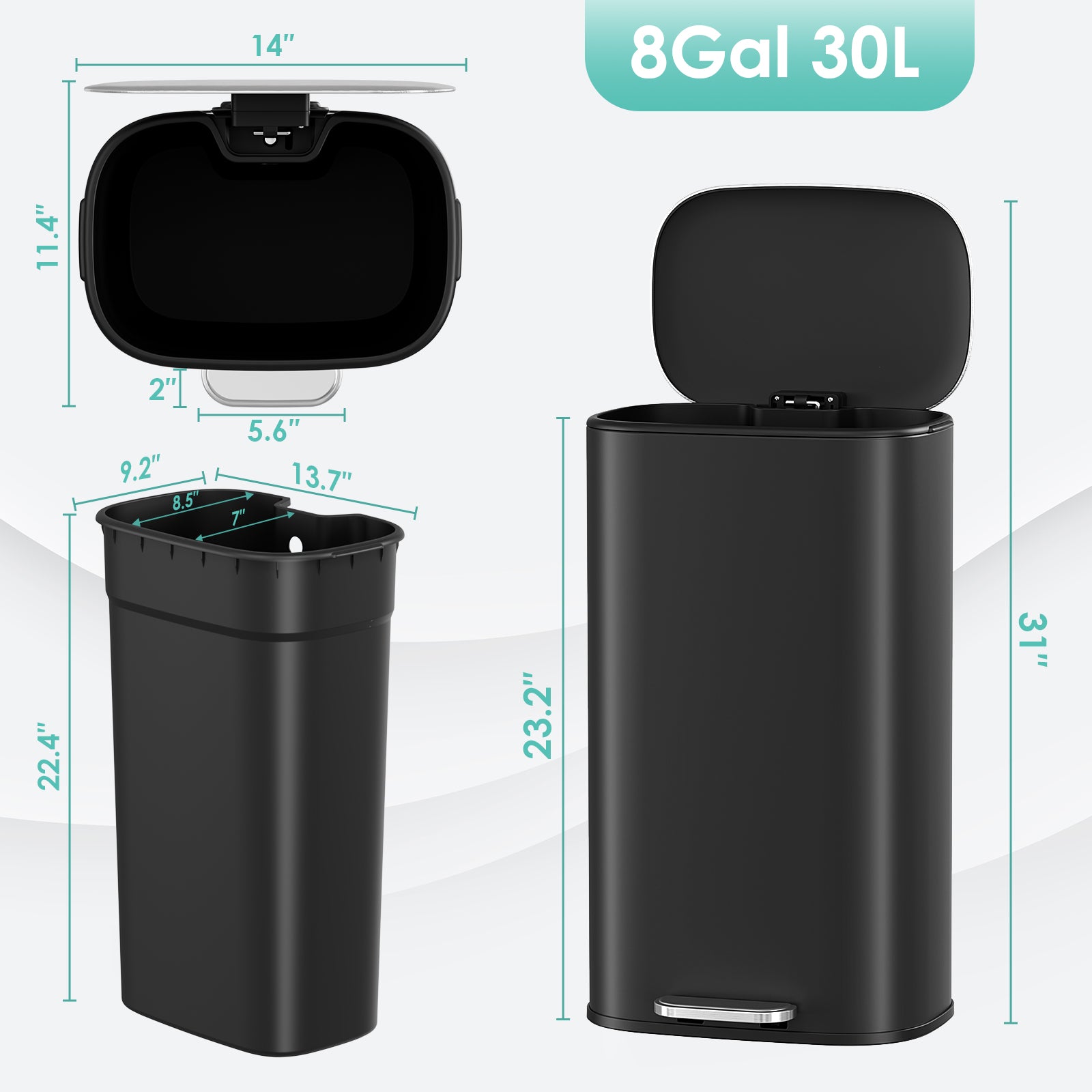 - 【Large Capacity & Removable Inner Bin】Kitchen trash has a capacity of 8 gallons, compact design suitable for various small spaces. It comes with a removable inner bin (13.7″ × 9.2″ × 22.4″) with a ring to secure trash bags avoid moving