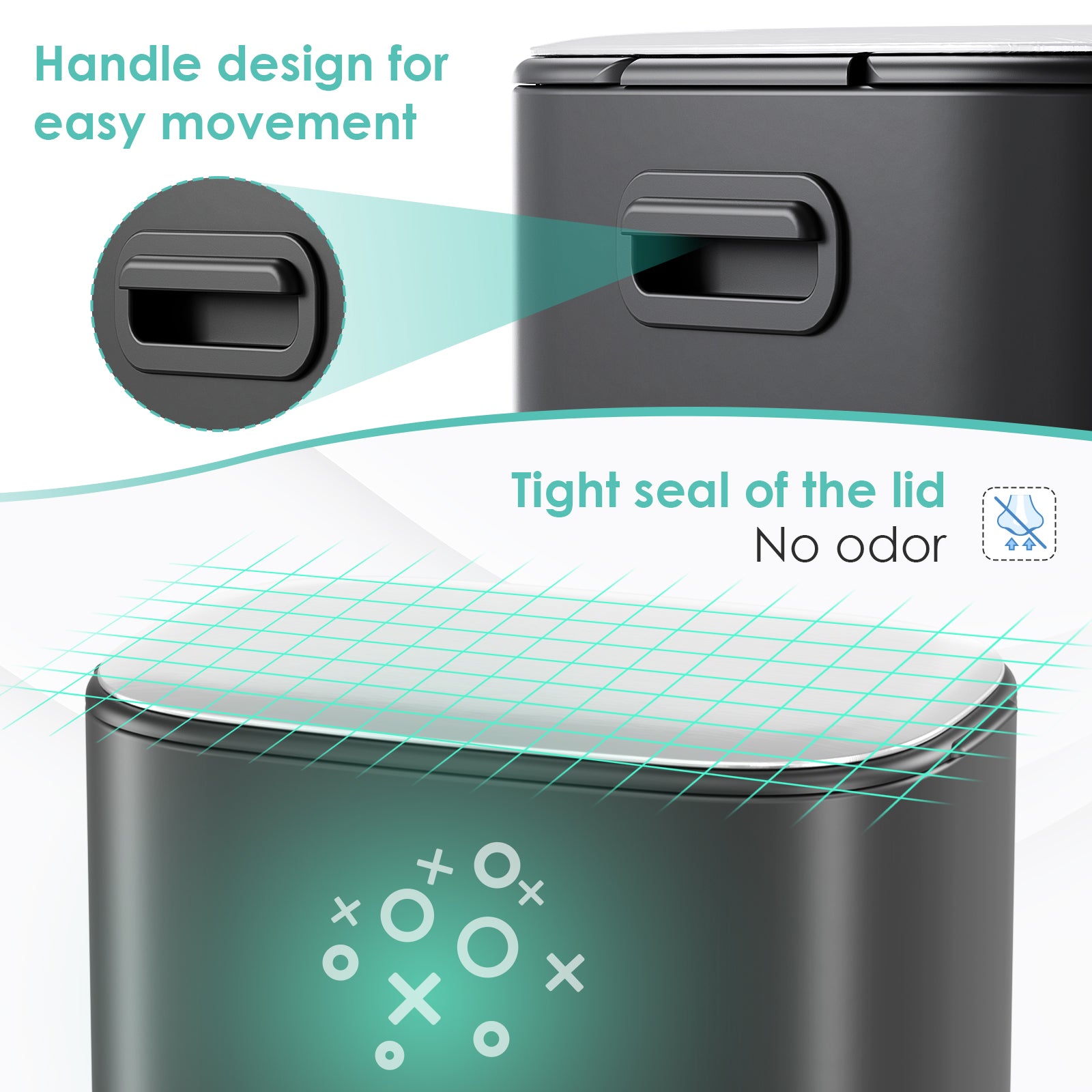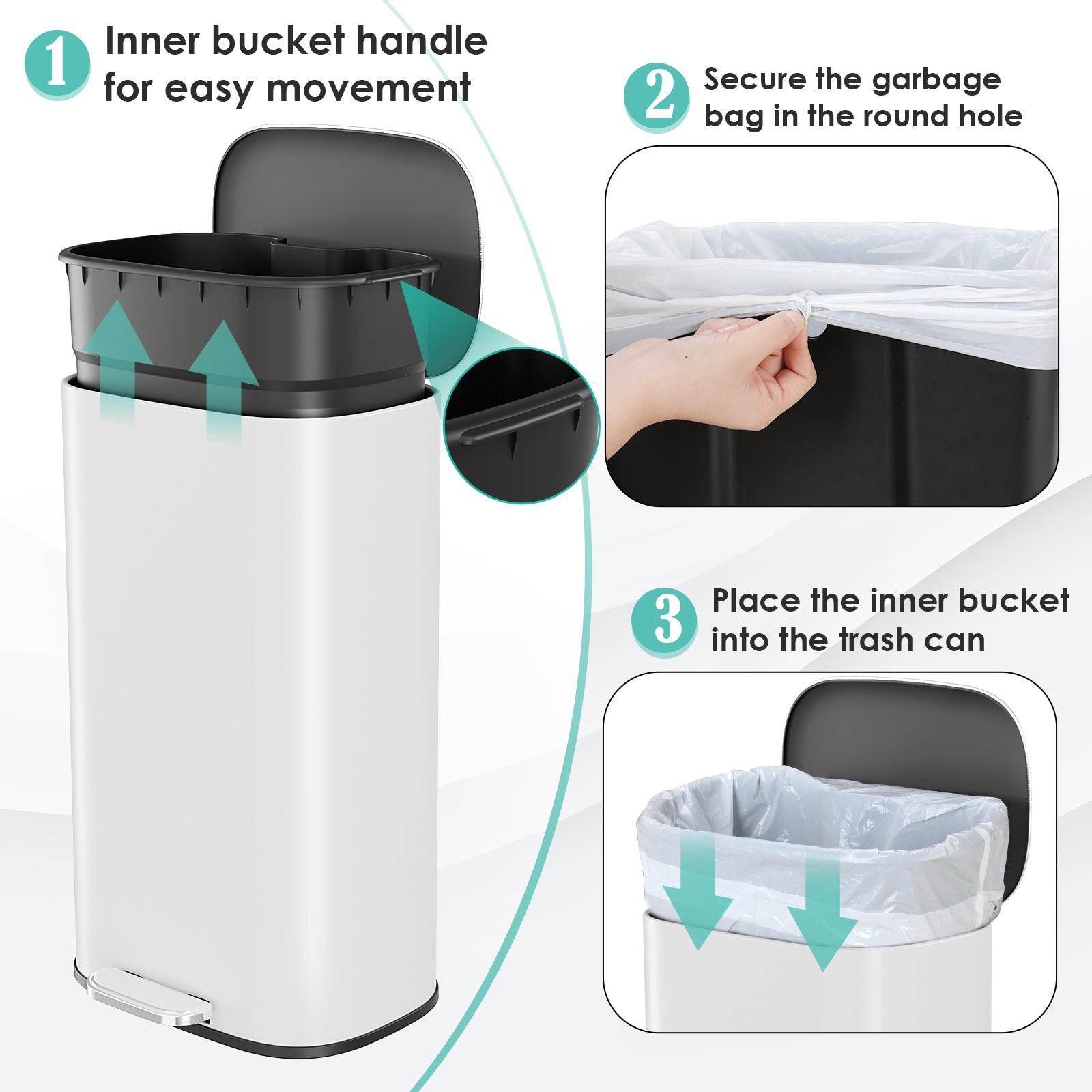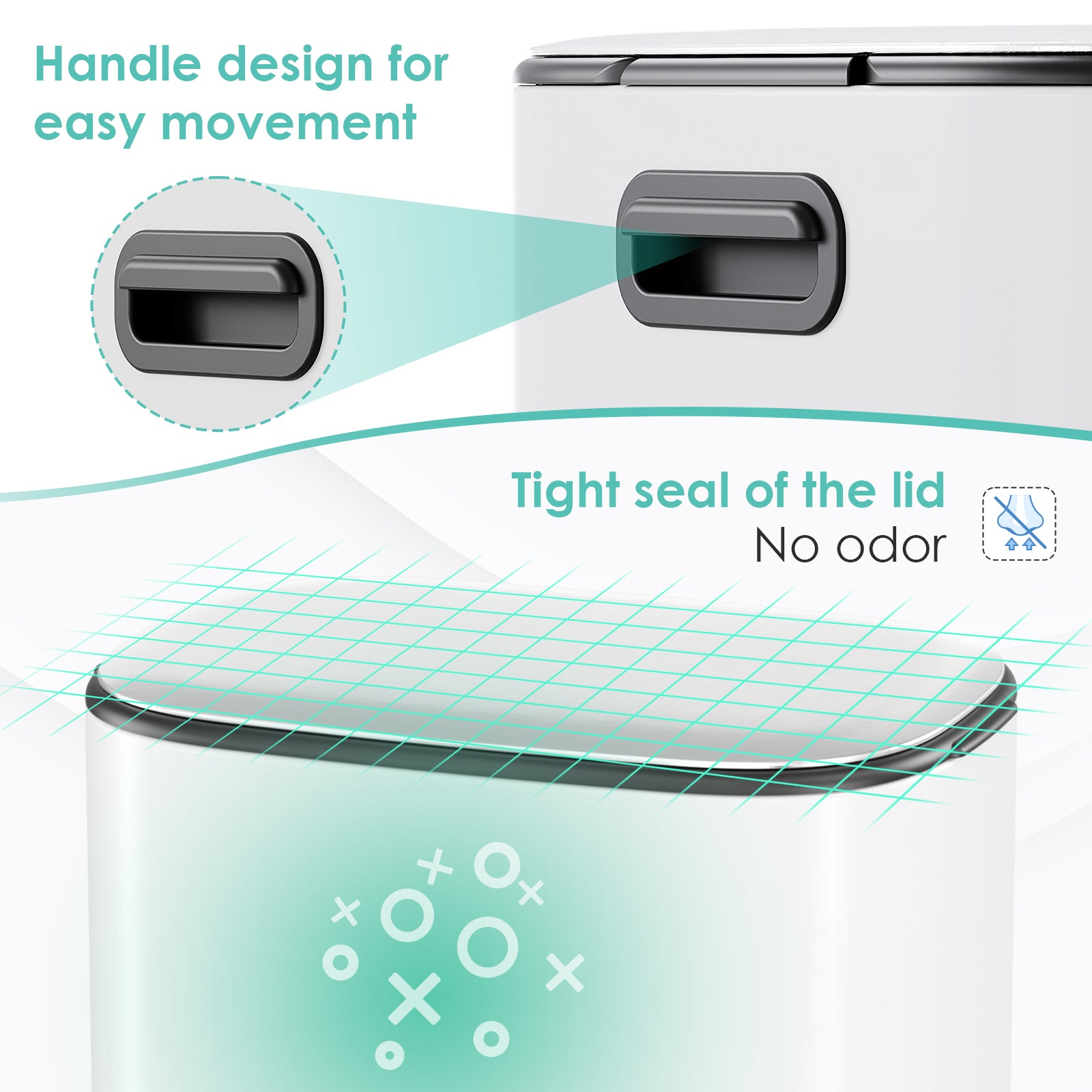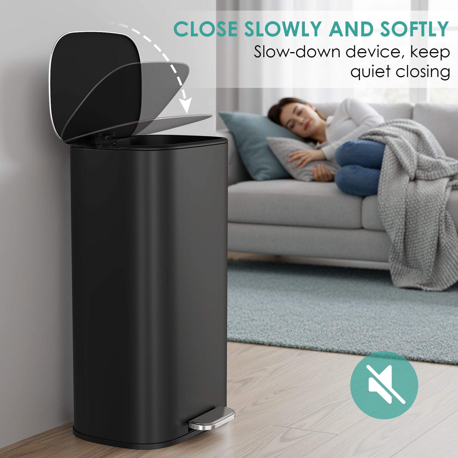 - 【Airtight & Slow Closing Lid】Step trash can features a slow-closing design, ensuring the lid opens and closes quietly and smoothly, avoiding pinching fingers or noise from disturbing your family. The sealed design can effectively prevents odors