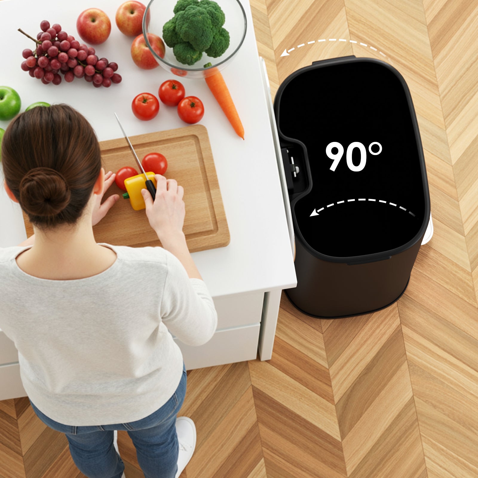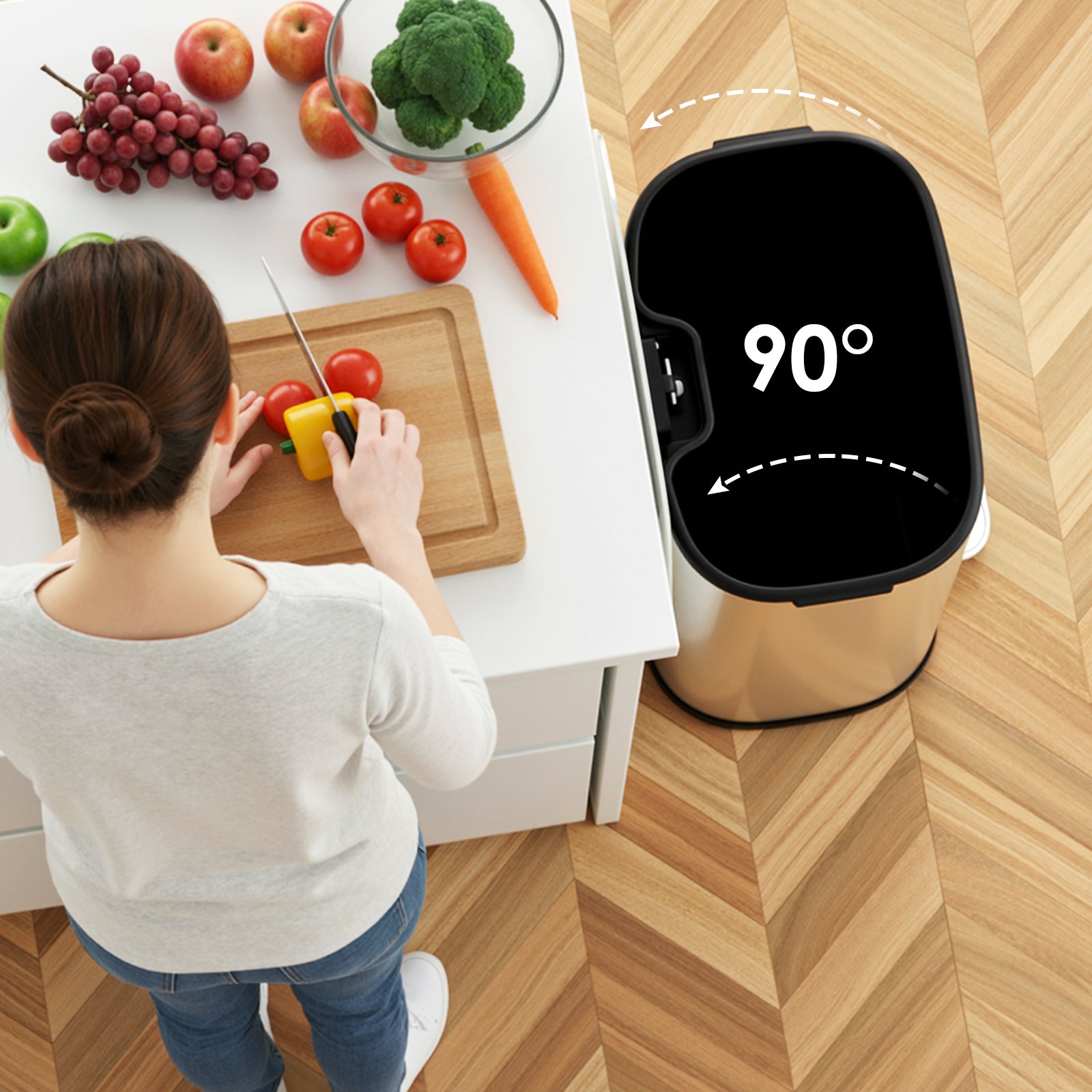 - 【Wide Pedal & Keep Open Desigh】Garbage can has a 2″ x 5.6″ foot pedal, which can be easily opened with a light press. You can also open the lid by hand and tilt it back 90° to keep it open for easy disposal of trash